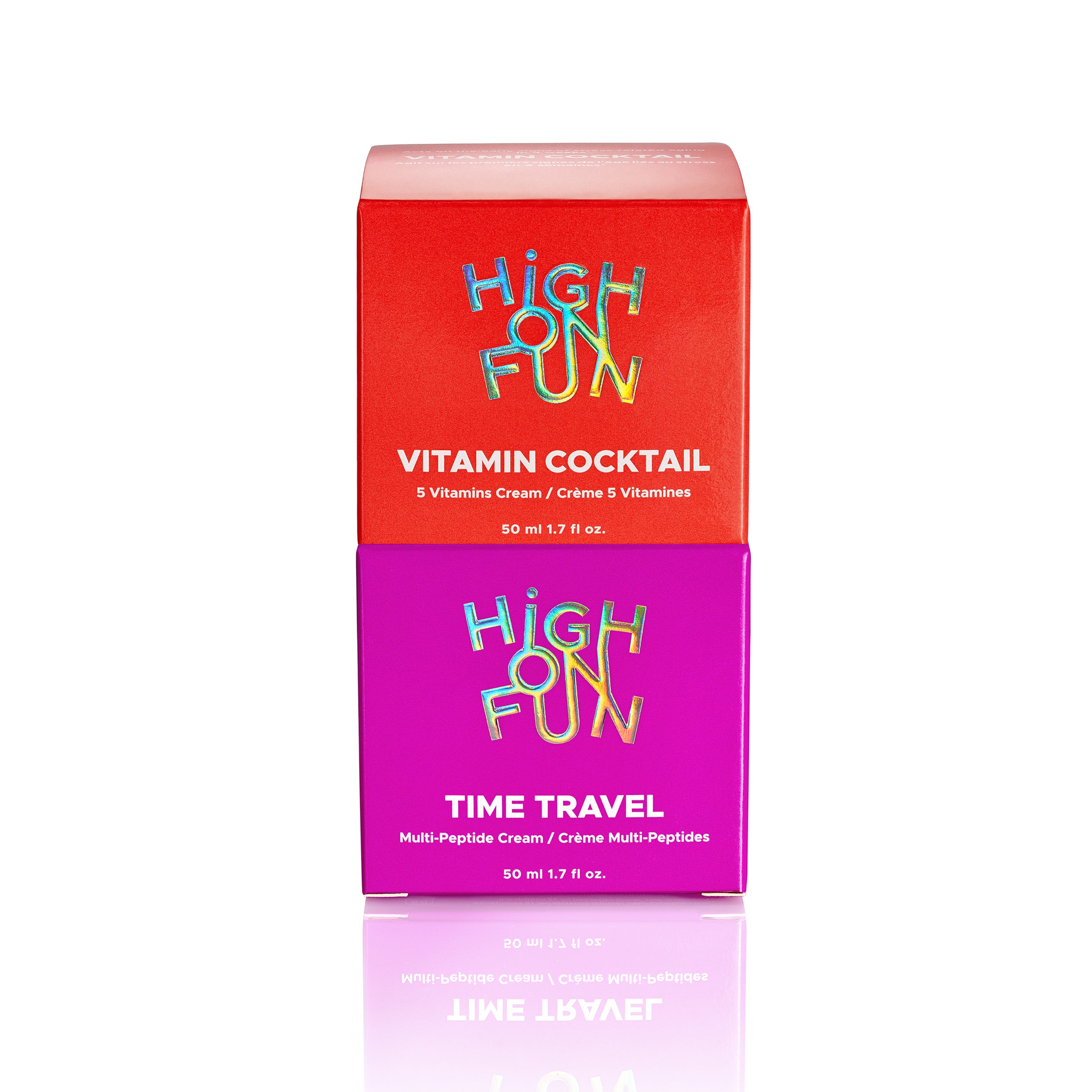 The meeting of our two iconic creams – Time Travel and Vitamin Cocktail – creates a unique baby-pink texture, rich in peptides and vitamins. This dopamine-infused ritual plumps, smooths, and brightens the skin overnight for a glow you can see the next morning.